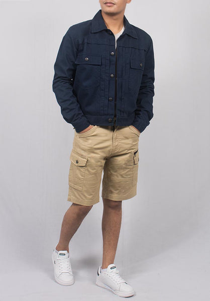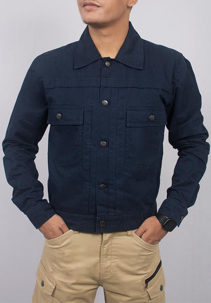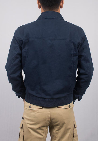 The Navy cotton twill patterned jacket from Harrington features a spread collar, a front button fastening, two chest patch pockets, side pockets, long sleeves, button cuffs, and a contrasting design. This jacket ensures turned heads and a barrage of compliments.